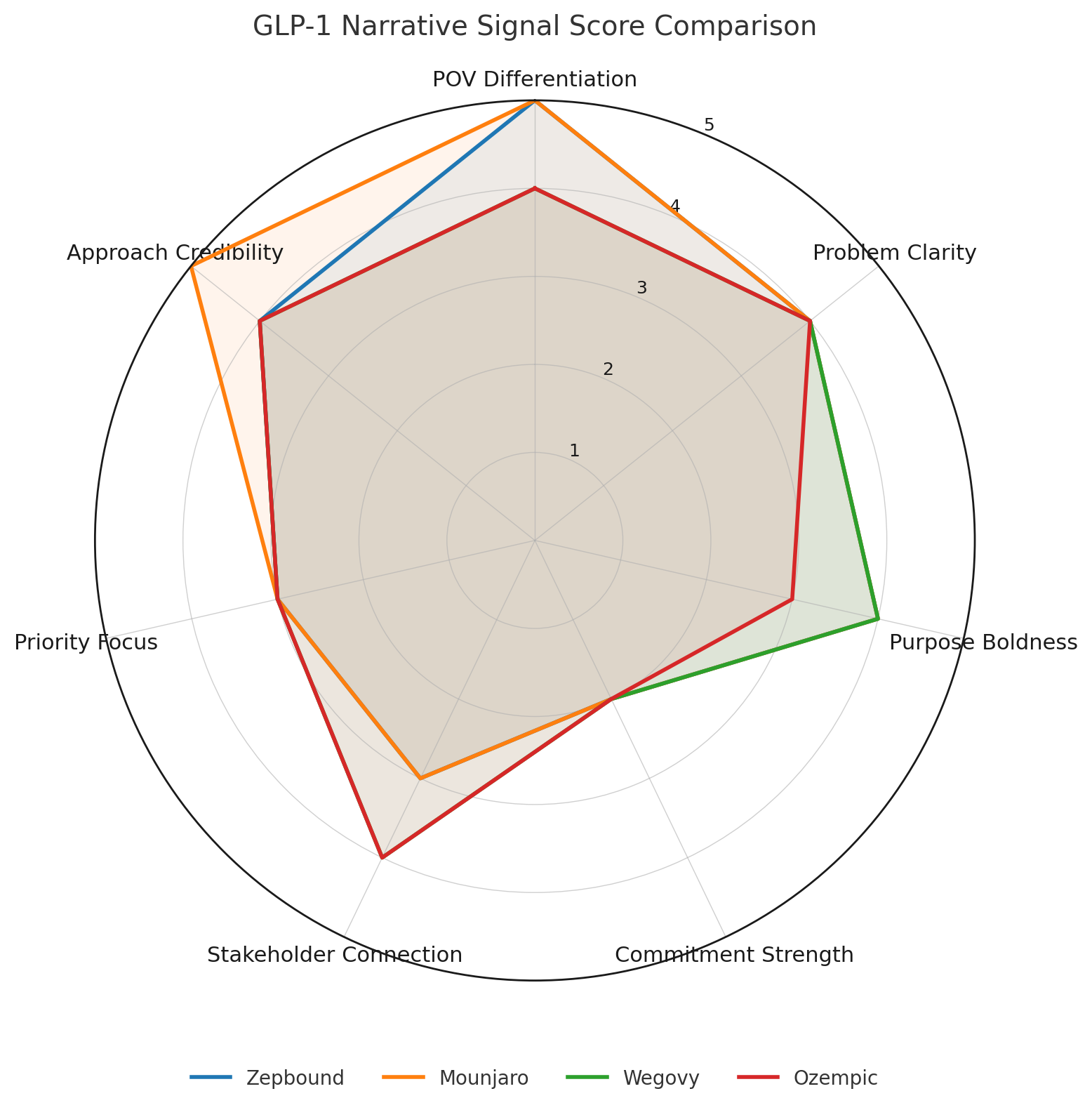 But in a $63 billion market projected to reach $100 billion in 2030, intuition about the story isn’t enough. My Signal Score™ diagnostic analysis of all four products backs it up with data. Looking at Lilly’s Zepbound and Mounjaro versus Novo Nordisk’s Ozempic and Wegovy, the numbers show Lilly nudging ahead in narrative clarity, credibility, and resonance. The scores are tight, with Zepbound (84/100), Mounjaro (81/100), Wegovy (78/100) Ozempic (75/100), but Lilly’s dual-receptor positioning is clearly “out-narrating” Novo’s heritage story.